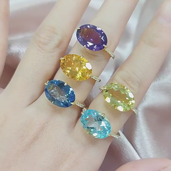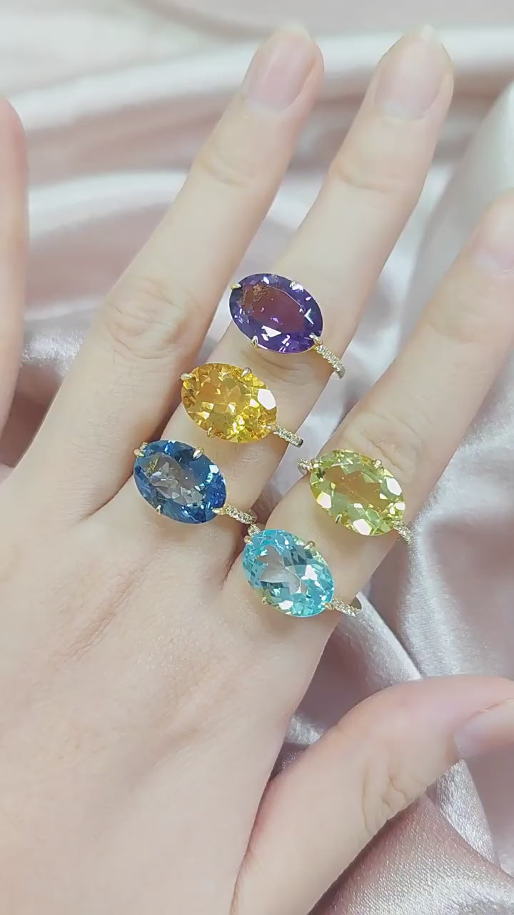 - Gemstones: Oval topaz with amethyst accents for a two-tone, sophisticated look.