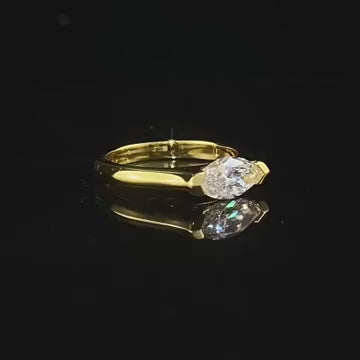 Embrace a modern twist on a classic with our East West Marquise Moissanite Engagement Ring. This stunning piece features a 1-carat marquise-cut moissanite (5x10mm), set in a contemporary east-west orientation that breaks from tradition for a truly unique statement. The solitaire setting in sleek 925 sterling silver, plated with durable 14k solid yellow gold, puts the full focus on the gemstone's remarkable elongation and captivating sparkle.