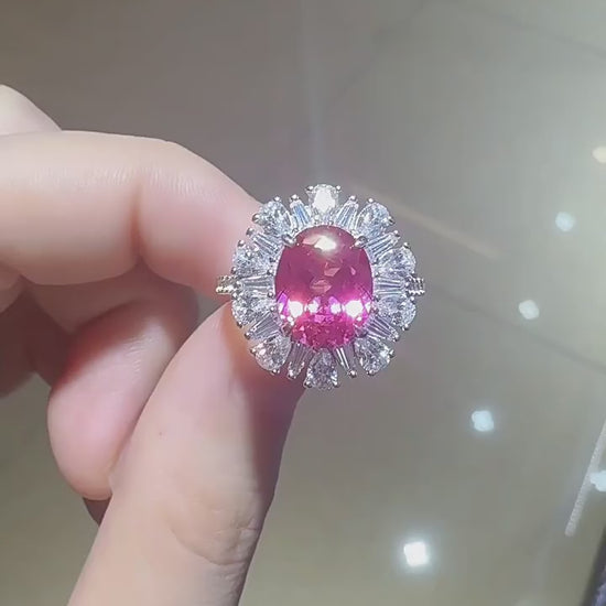 Embrace a symbol of love that blooms eternally with our exquisite Floral Lab Pink Sapphire Engagement Ring. Crafted for the modern romantic, this stunning piece features a vibrant 2-carat lab-created pink sapphire (8x10mm) at its heart, surrounded by a brilliant halo of 3A cubic zirconia. Set in premium 925 sterling silver with a luxurious gold plating, this ring beautifully merges sustainable luxury with timeless elegance. Its delicate floral-inspired design captures the grace of a blooming garden, making it a perfect representation of a love that grows more beautiful with each passing day.
