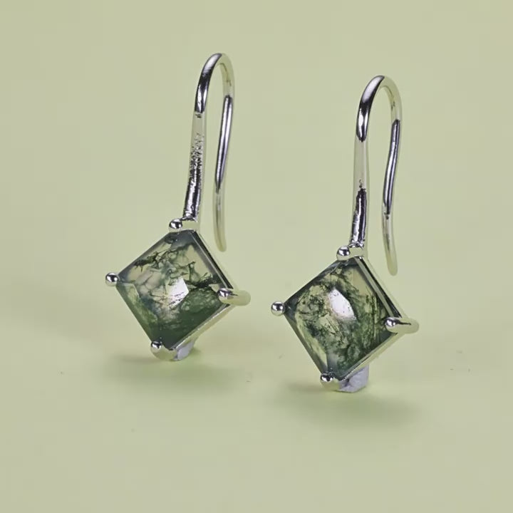 Moss Agate Princess Cut Dangle Earrings 925 Sterling Silver Aquatic Agate