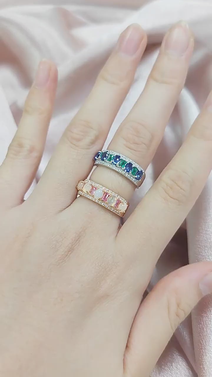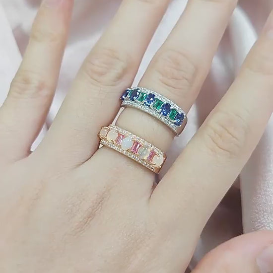 Discover the perfect blend of Oval Natural Opal & Lab Grown Sapphire Half Eternity Ring, available in two stunning gemstone options. Featuring your choice of either a mesmerizing natural oval opal or a brilliant lab-grown sapphire, this ring showcases a curated selection of gems in an elegant continuous band design. Crafted from premium 925 sterling silver, each piece displays exceptional craftsmanship with its perfectly aligned oval stones that create a seamless circle of brilliance around your finger.