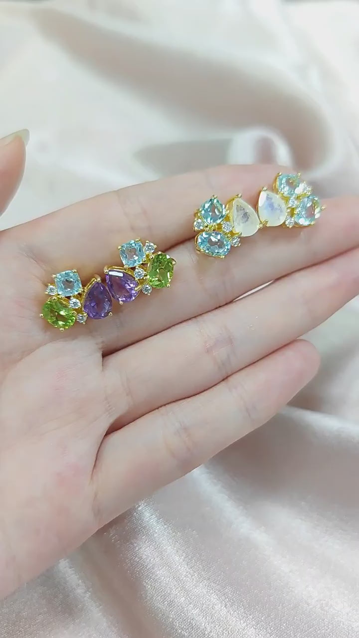 These stud earrings feature a refined combination of natural topaz and moonstone, complemented by natural amethyst, peridot, and topaz gemstones. Crafted from sterling silver, the set showcases geometric shapes that enhance their elegant appeal.