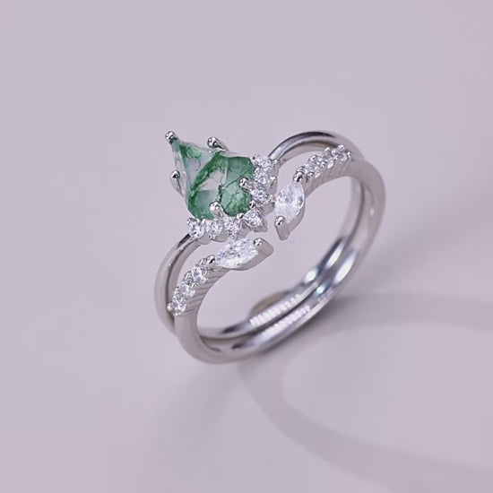 Vintage Kite Cut Green Moss Agate Engagement Ring Set offers a distinctive centerpiece for your engagement, blending vintage charm with everyday wearability.